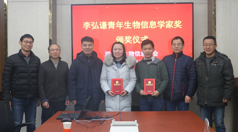 (图文|辛西)1月25日下午,逸夫楼C314会议室,湖北省生物信息学会第一届第六次领导班子会议及李弘谦青年生物信息学家奖颁奖仪式举行。学会理事长张红雨教授为2位青年生物学家龚静博士、王超龙博士颁发了证书和奖杯,以表彰龚静博士“在遗传变异的功能预测方面取得突出成果”和王超龙博士“建立复杂疾病分子机制推断的计算方法”。2位获奖者对学会的表彰表达感谢。随后就当前生物信息领域的研究热点和2位获奖者的研究领域,在座学会领导班子成员与2位博士进行了交流。
