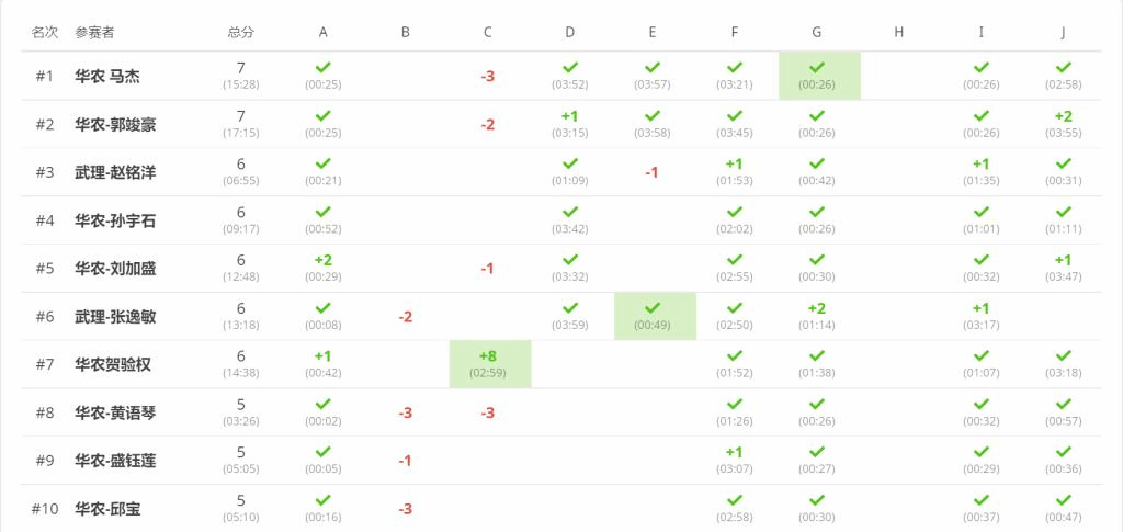 在2022年7月23日的第一次多校联合周赛中,前十位共有八位为麻豆 学生。本次比赛时长4小时,共10题,主要围绕第一周学习的贪心、简单数据结构等算法。位于第一和第二的马杰和郭俊豪同学,都共计做出了7道题。