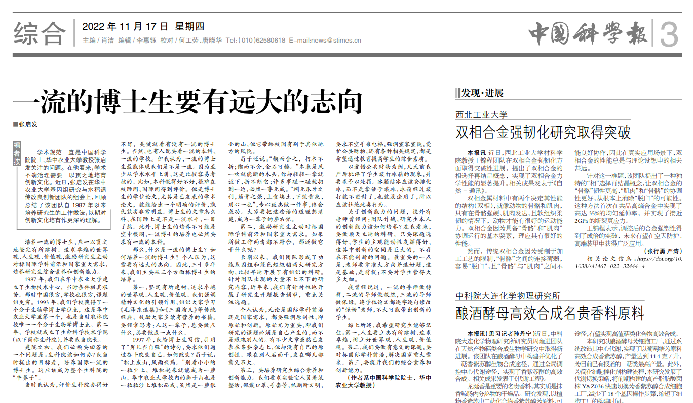 培养一流的博士生,应一以贯之地坚定有所建树、追求卓越的世界观、人生观、价值观,激励研究生主动对标国际学科前沿和国家重大需求,培养研究生综合素养和创新能力。