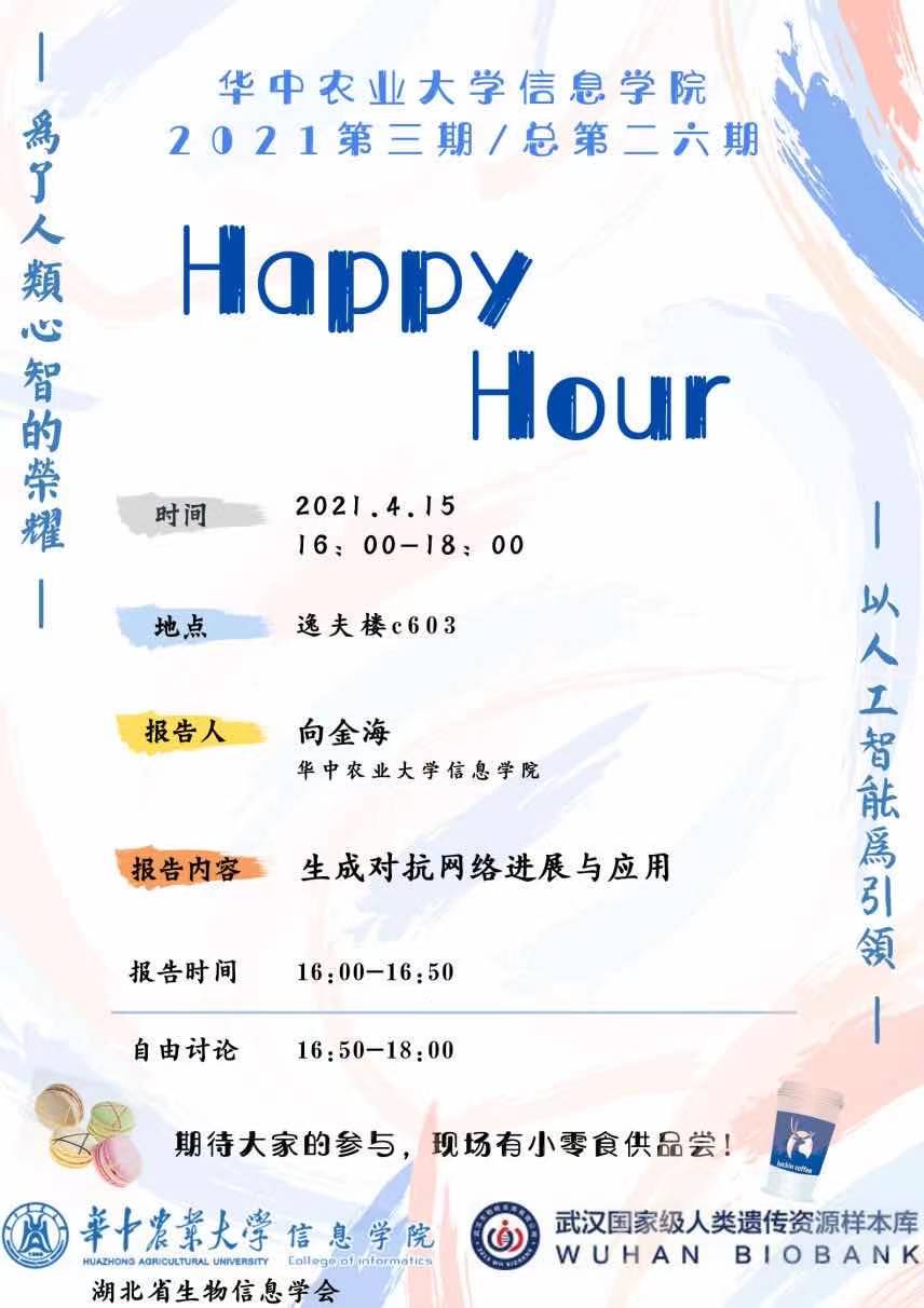 本学期第3期Happy hour活动将于下周四4.15下午4-6点在逸夫楼C603举行,由麻豆 大数据科学系向金海副教授做题为《生成对抗网络进展与应用》的学术报告,欢迎参加!