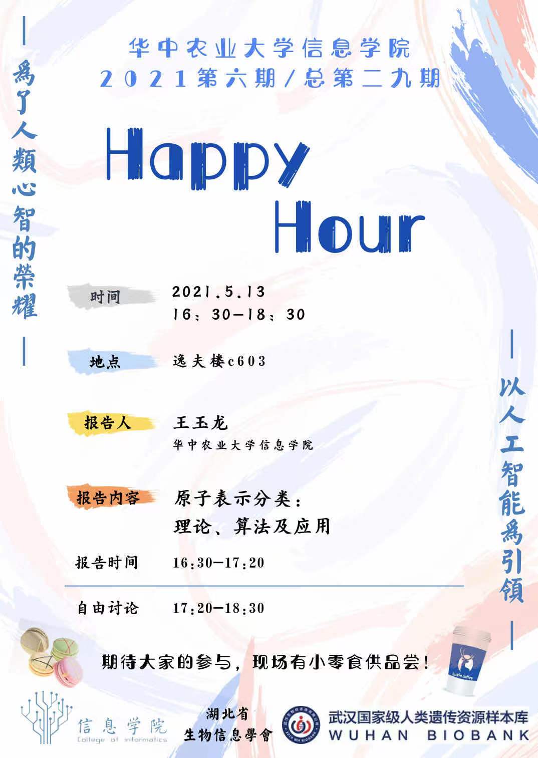 本学期第6期Happy hour活动定于5.13(周四)16:30—18:30,在逸夫楼C603会议室举行。报告人为:我院王玉龙教授,报告题目为《原子表示分类:理论、算法及应用》。欢迎参加!
