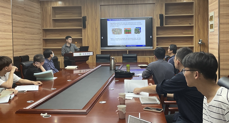 报告结束,王玉龙教授和在场师生就原子表示分类及应用方面进行深入探讨。张红雨老师提出人工智能与生物智能的关系和进化过程,胡学海老师、牛晓辉老师、倪福川老师就该问题进行了讨论。胡学海对原子表示分类框架展现浓厚兴趣,并询问在实际应用中最优原子集的选择问题,王玉龙老师就该问题给出详细答复。有学生咨询王老师关于原子表示分类与统计学习理论中Rademacher的关系,王老师给出详细解释。最后,周雄辉老师仔细询问了原子表示分类方法在多组学分析中的应用问题,王玉龙非常肯定了该想法,并认为机器学习方法在多组学分析中有重要的应用价值和前景。本次学术研讨在轻松愉悦的自由交流环节结束。
