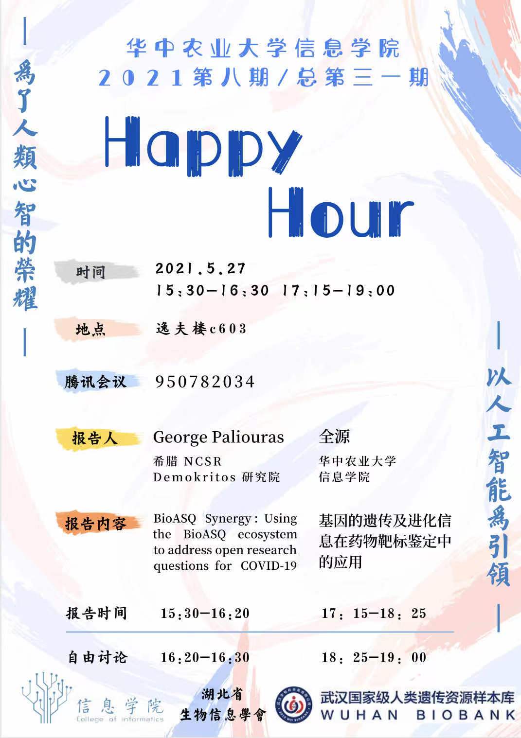 本学期第8期Happy hour活动将于5月27日(周四)下午3:30-6:00点在逸夫楼C603举行,由学院全源老师和希腊NCSR Demokritos研究院George Paliouras分别做报告,欢迎参加。