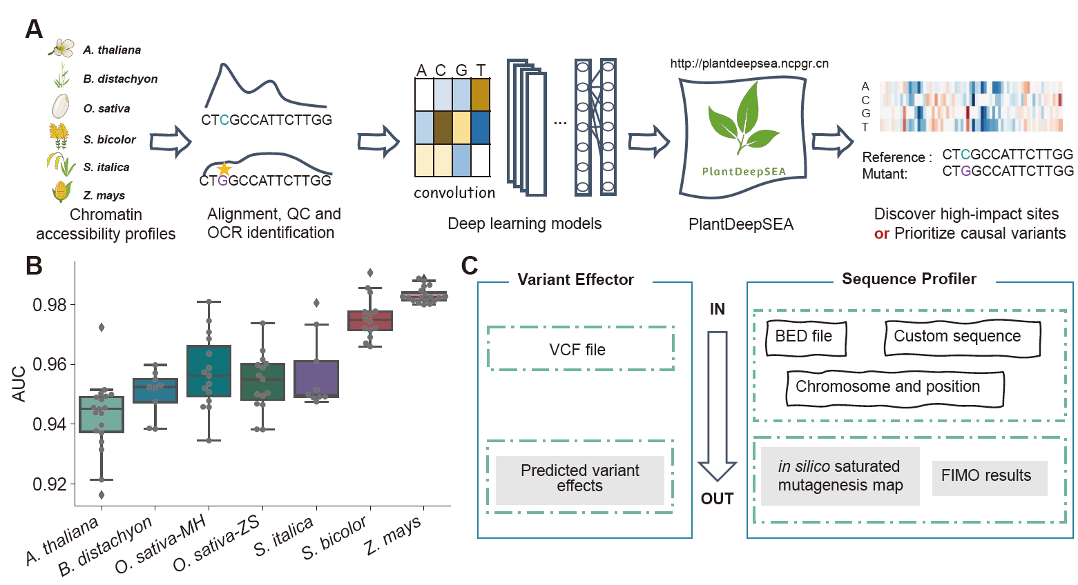 尽管此类方法在人类医学中已得到一定应用,但这一领域的研究在植物中仍关注较少。此外,深度学习模型的构建需花费大量计算资源,很难被普通实验研究者直接利用。因此,植物中亟需可以帮助研究者快速评估序列变异调控效应以及鉴定序列中的调控元件在线网络服务。