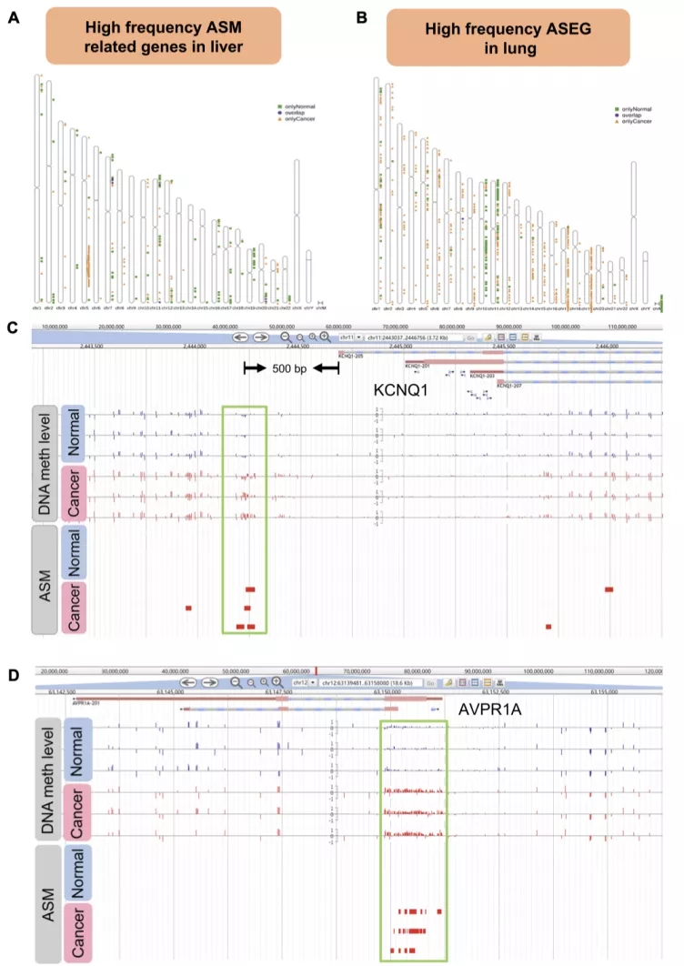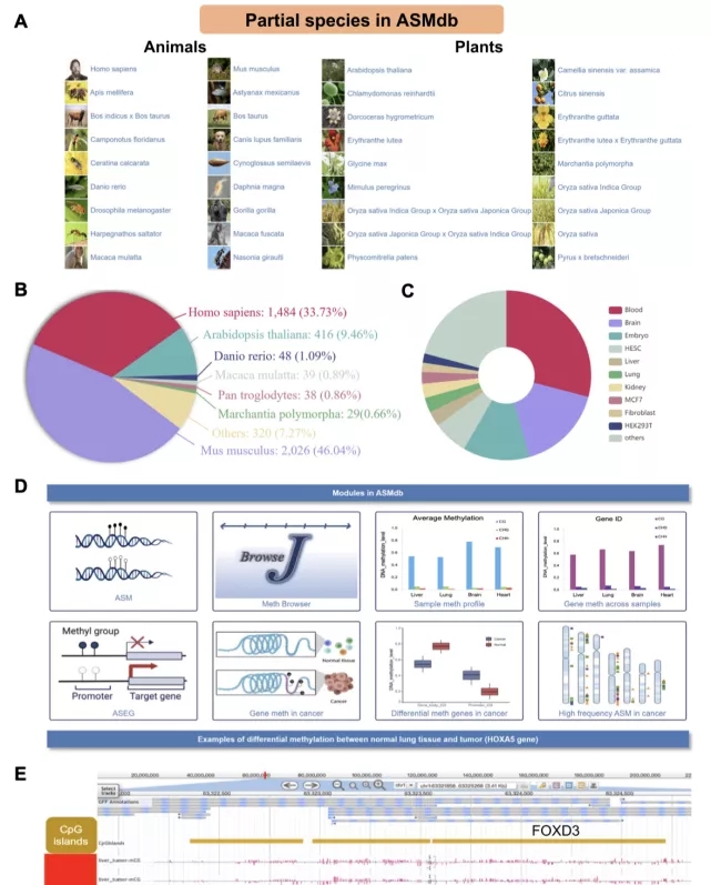 此外,为提供更多关于癌症中DNA甲基化和ASM信息,团队成员还整理了人类DNA甲基化的数据,并利用足够的数据样本对9个组织(包括肝脏和肺等)的癌症和正常样本进一步做了差异DNA甲基化和高频ASM分析(图2A, B)。通过分析发现,部分结果与已报道的关键肿瘤基因ASM变化是相一致的,而且团队成员还发现了几个潜在的ASM肿瘤相关基因(图2C),这些具体分析结果能促进癌症中ASM的研究。ASMdb是一个全面的多物种ASM数据库,可为后续ASM的分析和应用提供丰富资源,并促进ASM在疾病发生、动植物发育等各方面研究。