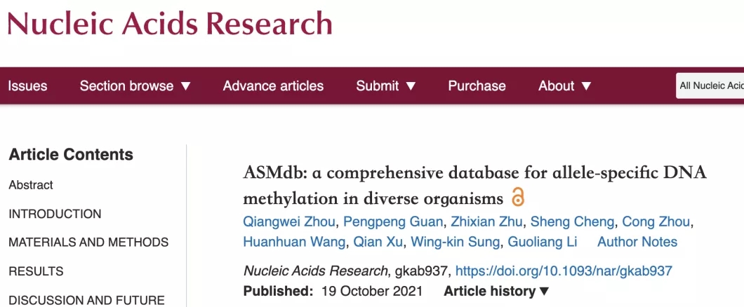 Allele-specific DNA methylation数据库(ASMdb)由华中农大麻豆 完成。学院李国亮教授为论文通讯作者,周强伟、管鹏鹏、朱志贤为共同第一作者。数据库的建立还有华中农大成盛、周聪、王欢欢、续倩及新加坡国立大学Wing-kin Sung教授帮助完成。该研究数据分析工作得到华中农大作物遗传改良国家重点实验室生物信息计算平台支持和帮助。