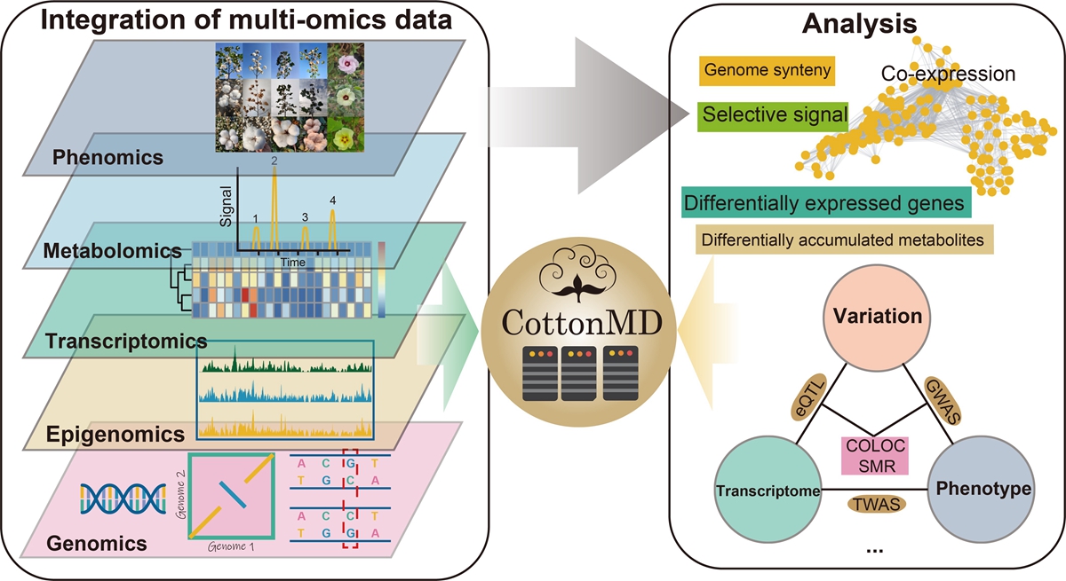 近年来已逐渐发展成熟的多组学技术可以为研究者提供更广泛、更多维度的信息来加速育种进程,为解决传统遗传育种方法中存在的问题、加速实现精准育种提供了新的途径。为发挥多组学技术在育种中的价值,水稻、玉米、高粱等多个主要作物的多组学数据库平台相继建立,但仍缺少一个综合型的棉花多组学数据库平台。为解决这一问题,研究者通过整合25个棉花基因组、76个组织样本的转录组、5个物种的表观遗传学、4180个样本的群体遗传变异数据、20个表型和768个代谢物含量等公共多组学数据,构建了目前最为系统和全面的棉花多组学数据库-CottonMD。