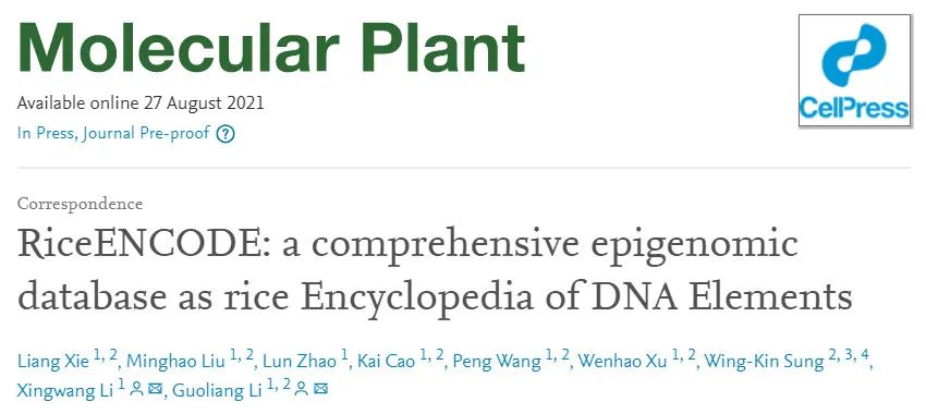 8月27日,Molecular Plant 在线发表麻豆 李国亮教授和李兴旺教授团队题为 RiceENCODE: a comprehensive epigenomic database as rice Encyclopedia of DNA Elements 的研究论文,报道了一个整合水稻多元表观基因组数据的数据库。该数据库基于团队此前发表的水稻20个品系参考表观基因组图谱和水稻高分辨率三维基因组结构数据 ,收集了公开发表的水稻多品种多组织多维度的表观基因组信息,展示了水稻不同类型的染色质调控元件,立体地呈现了水稻品种和组织间复杂的基因表达调控关系。这是参照人类的ENCODE计划,推进水稻功能基因组研究的重要一步。
