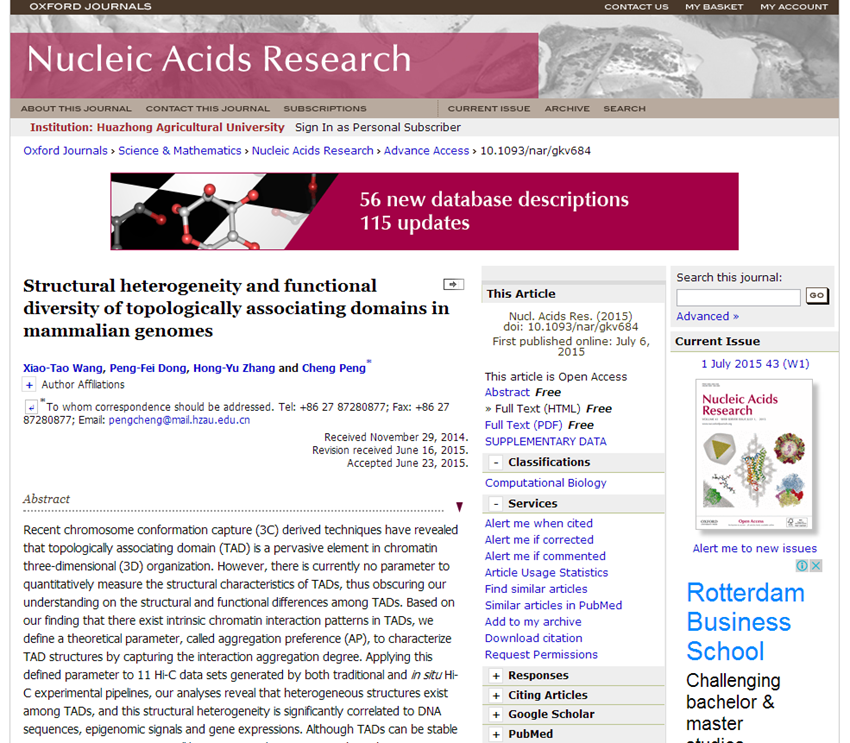 近日,麻豆 3D基因组研究团队在解析染色质三维空间结构及其生物功能上取得进展,并于7月6日由学术期刊《核酸研究》在线发表了题为“Structural heterogeneity and functional diversity of topologically associating domains in mammalian genomes”的学术论文。论文的通讯作者是彭城副教授,第一作者是王小滔博士研究生。