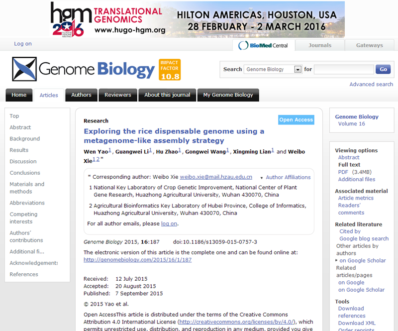(文|作物遗传改良国家重点实验室 卓重)近日,《Genome Biology》(《基因组生物学》,IF: 10.8)在线发表了麻豆 作物遗传改良国家重点实验室水稻团队在水稻基因组研究中取得的新进展。论文以“Exploring the rice dispensable genome using a metagenome-like assembly strategy”(使用宏基因组序列拼接策略探索水稻非必需基因组)为题,基于1483份水稻品种的低覆盖度基因组测序数据,开发创新的分析策略探究了水稻“非必需基因组”的构成及其潜在功能。谢为博副教授为该论文的通讯作者,博士生姚文为第一作者。该杂志同时配发了亮点评论“Harvesting rice’s dispensable genome”(收获水稻非必需基因组),高度评价了该研究的科学意义和应用价值。