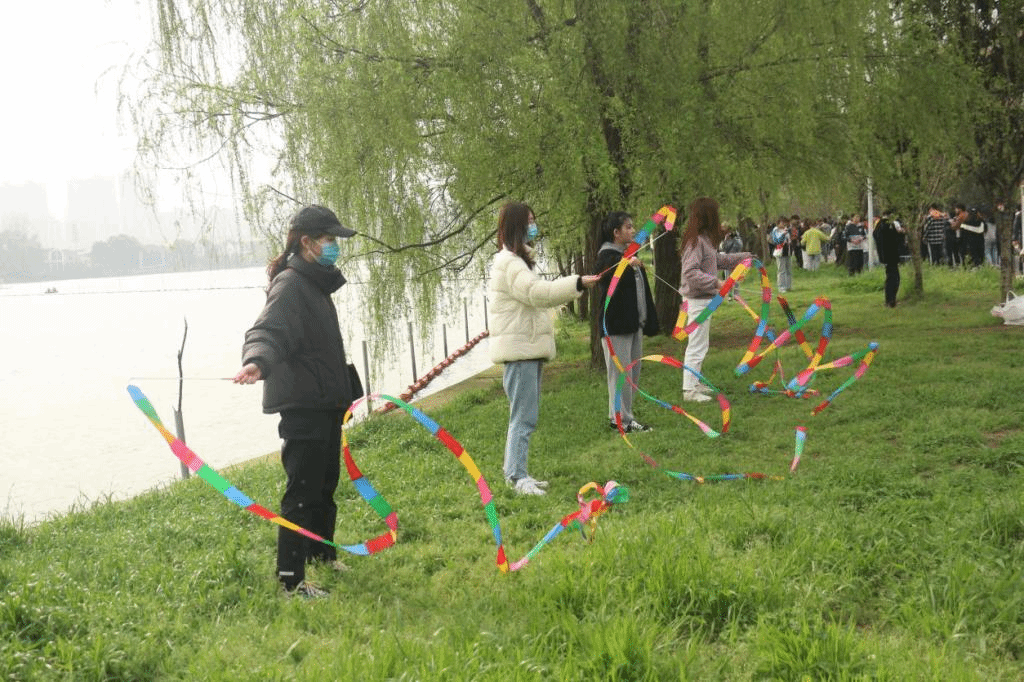 在环校跑的过程中,还有丰富多彩的传统体育项目等待同学们体验,在沿湖东路草地上,空竹声伴着同学们跳皮筋、舞绸缎的身影;在二十四节气柱草坪上,舞狮无疑使最靓丽的风景;而行政楼青年湖平台上,还有打陀螺、踢毽子、呼啦圈这些耳熟能详的运动。
