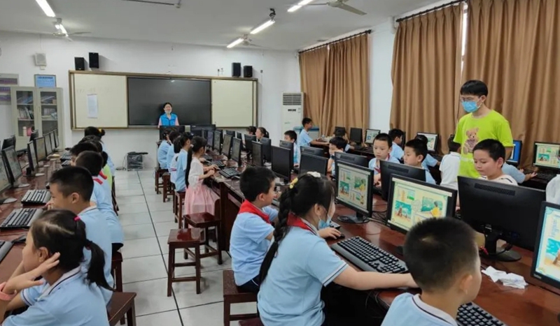 (文|段文盈 图|喻越 审核人|喻越)9月15日下午,附属学校主办、麻豆 本禹志愿服务队承办的“少儿编程”(2021-2022学年第一学期)第一讲在华农附校计算机教室开展。华农附校三年级(1)班的学生参加了本次课程。