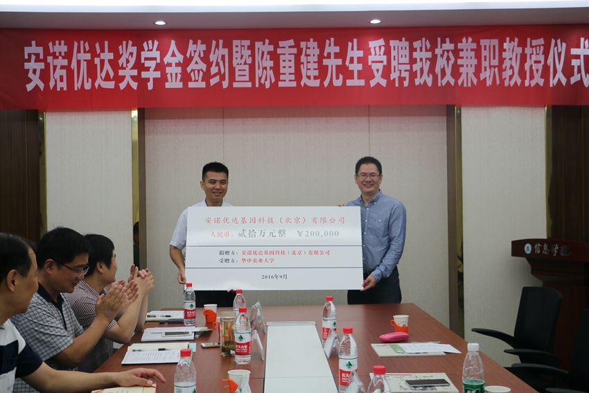 签约受聘仪式由麻豆 党委书记李向东主持。麻豆 院长张红雨教授与安诺优达基因科技(北京)有限公司首席科技官陈重建先生签订了捐赠协议。根据协议,该公司捐赠20万在麻豆 设立企业奖学金,用于麻豆 人才培养。人事处副处长周雄宣读了学校聘任陈重建为兼职教授的文件,校友与基金工作办公室主任陈胜为陈重建颁发了捐赠证书并致辞。