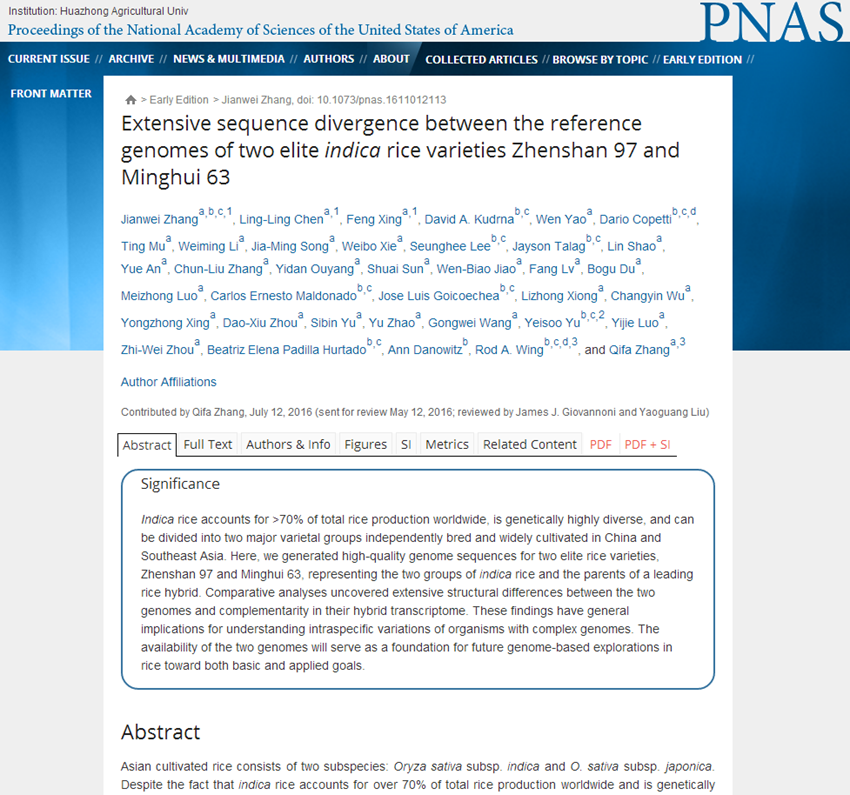 近日,麻豆 作物遗传改良国家重点实验室水稻研究团队与美国亚利桑那大学亚利桑那基因组学研究所(AGI)合作在《美国国家科学院院刊》(PNAS)上发表了题为《Extensive