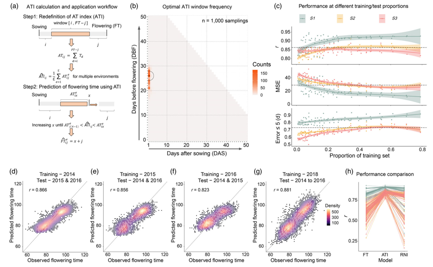 进一步研究发现,相比抽穗期,传统定义的ATI在不同环境下表现出较小的变异,提示ATI可能是实现跨环境预测的重要基础。而通过优化ATI计算窗口的起点和终点,可能可以得到一个更加稳健的ATI定义,从而提高基于ATI的抽穗期预测模型的准确性。为此,该研究通过枚举所有1730个候选时间窗口,基于大量的多点田间试验数据系统评估了不同ATI计算窗口的预测效果。通过1000次抽样分析,最终确定播种后1天至开花前26天为最佳计算窗口(图1)。有趣的是,这一时间窗口恰好对应水稻的营养生长阶段,其终点(开花前26天)大致对应成花转换的关键时期,揭示了温度累积与水稻发育转变的生物学联系。
