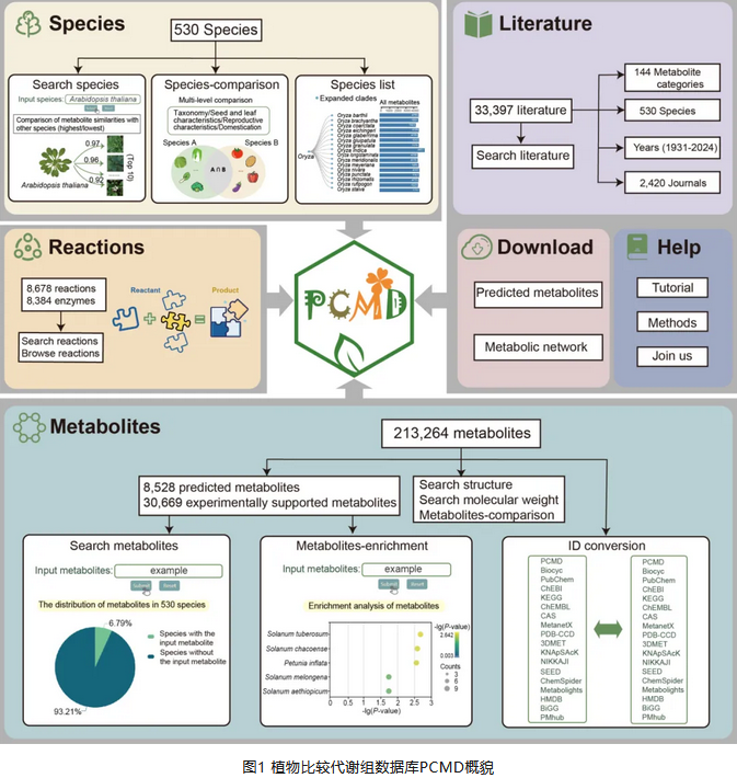 7月10日,华中农大生物信息团队在Plant Communications上发表题为“PCMD: A multilevel comparison database of intra- and cross-species metabolic profiling in 530 plant species”的研究成果。该研究基于530种植物的代谢网络、代谢物、反应式和丰富的物种分类信息等,搭建了植物比较代谢组数据库PCMD (//yanglab.madou-vip.net/PCMD),为促进植物比较代谢组学研究提供了宝贵的资源和分析平台。