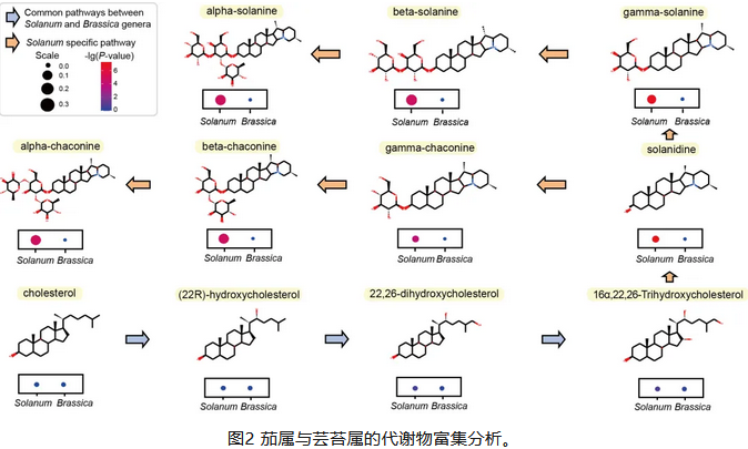基于搭建的PCMD数据库,研究者使用“物种比较”工具对茄属和芸薹属植物之间的代谢物差异进行了案例研究。结果显示,α-卡茄碱和α-茄碱在茄属植物中特异性存在。进一步的富集分析发现,芸薹属植物可能因缺乏将16,22,26-三羟基胆固醇转化为茄烷的途径,进而导致α-卡茄碱和α-茄碱的合成受损(图2)。对茄属和芸苔属植物之间的代谢物差异分析,不仅为了解这两类植物间的生化差异提供了有价值的参考,同时也展示了PCMD在揭示植物间代谢物多样性方面的能力。