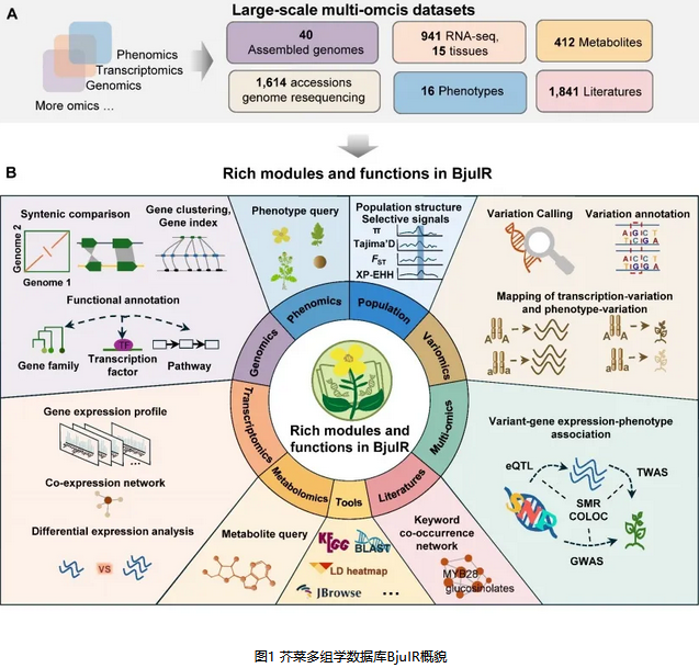 近日,麻豆 、园艺林学学院、湖南农业大学以及湖南省农科院作物研究所等多单位在Plant Communications 发表论文BjuIR: a multi-omics database with various tools for accelerating functional genomics research in Brassica juncea。该研究通过搜集和整合芥菜基因组、转录组、变异组、表型组和代谢组等5个组学的数据,构建了首个芥菜多组学数据库BjuIR,为芥菜功能基因组学研究和遗传育种提供了宝贵的数据资源和分析平台。