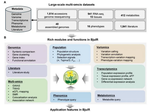 BjuIR是首个芥菜多组学数据库,它整合并系统分析了目前最为全面的芥菜多组学数据,为用户提供了丰富且友好的数据检索、挖掘和获取功能,显著地提高了芥菜功能基因组研究和候选基因挖掘的效率和便捷性,并助力芥菜遗传育种改良。