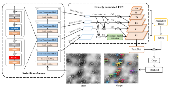 研究人员介绍,该论文提出一种基于深度Transformer的病毒电镜图像信息实例分割网络,可自动获取电镜图像中病毒的位置、轮廓和类别信息,快速、准确完成病毒鉴定。该网络采用Swin Transformer提取输入图像特征,并设计了一种基于坐标空间注意力机制的密集特征金字塔网络,进一步获取高分辨率、多尺度的病毒特征,最后通过预测网络和原型网络实现病毒的实例分割。结果显示,该方法mAP准确率和F1值分别为83.8和0.92,超过SparseInst,SOLOv2,RTMDet、YOLACT++等顶尖实例分割算法。