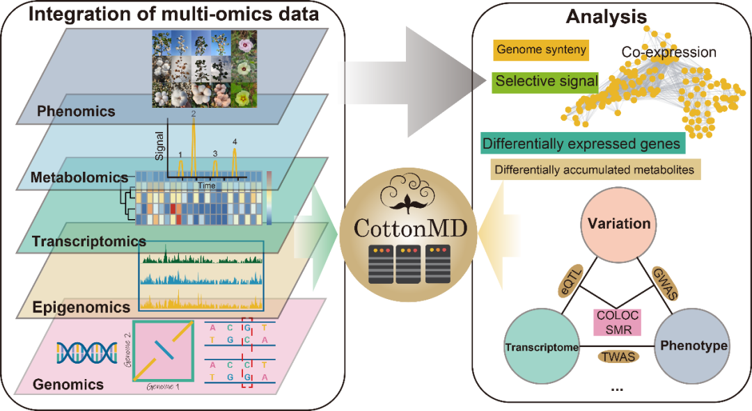 、中国农科院棉花研究所生信中心以及新疆农垦科学院棉花所等多单位在国际权威学术期刊Nucleic Acids Research上联合发表了题为CottonMD: a multi-omics database for cotton biological study的研究论文。该研究通过搜集和整合棉花基因组、转录组、变异组、表观遗传、表型组和代谢组等6个组学的数据,构建出目前最为系统和全面的棉花多组学数据库,为棉花遗传育种研究提供了重要的数据资源和分析平台。