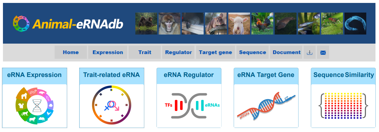 增强子RNA(Enhancer RNAs, eRNAs)是由增强子转录形成的一类非编码RNA。转录组学和(表观)基因组学最新研究进展表明,活性增强子可以打开局部染色质结构并暴露DNA基序以吸引转录因子 (TF),这些TF进一步招募RNA聚合酶以生成非编码 RNA (ncRNA),其被定义为增强子RNA (eRNA)。在早期研究中,eRNA仅被视为增强子转录的副产品,没有特定功能。随着对 eRNA 的日益关注,越来越多的证据表明,eRNA的表达不仅与增强子的活性高度相关,还与基因调控及疾病发生发展有着重要的关系。例如,eRNA OLMALINC可以通过调节硬脂酰辅酶A去饱和酶来影响体重。由于eRNA的重要性,已经在各种人体组织中鉴定了许多eRNA,并已开发数个人类的eRNA数据库如HeRA、eRic和TCeA。然而,eRNA在动物中的表达情况尚未完全阐明。此外,许多增强子高度保守,有些甚至在长进化距离内是保守的。因此,对保守eRNA的进一步研究有助于更好地了解不同物种中增强子和eRNA的潜在功能。总之,eRNA的表达图谱和其之间的保守性研究对揭示基因表达调控和动物表型的潜在机制具有重要价值。