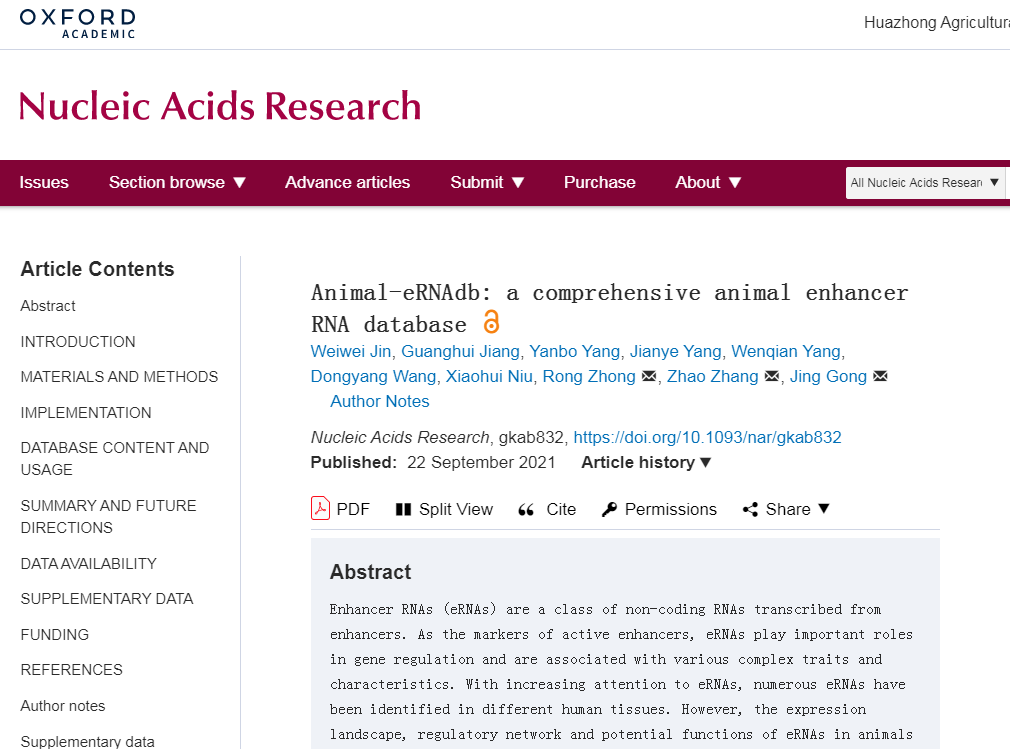 (图文|金炜炜 审核人|龚静)近日,我院龚静教授研究团队在《Nucleic Acids Research》杂志发表题为《Animal-eRNAdb: a comprehensive animal enhancer RNA database》的数据库文章。该文章对10种动物不同组织的增强子RNA(eRNA)进行了深入分析,发现了大量组织特异表达的eRNAs,并构建了在线数据库,方便其他研究者使用。龚静教授和上海复旦大学张朝教授为共同通讯作者,我院博士金炜炜和硕士蒋光辉为共同第一作者。