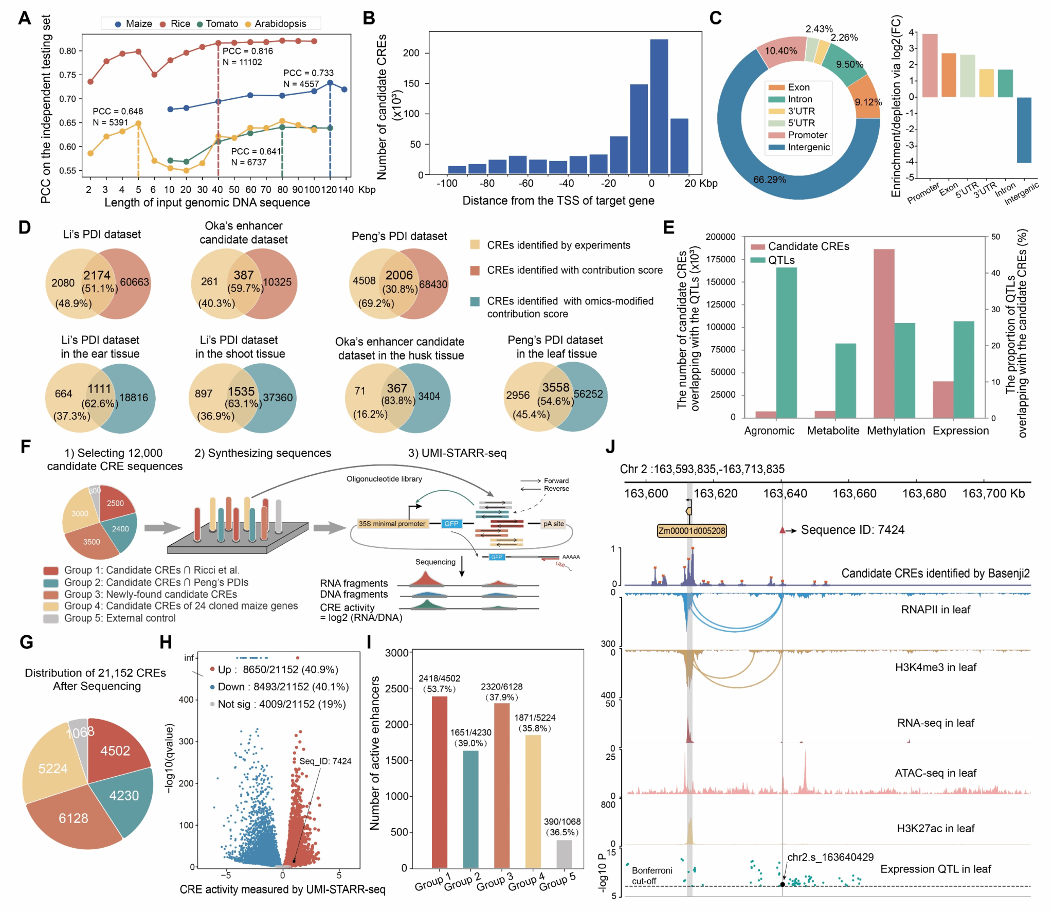 针对上述两个瓶颈问题,该研究采用学科交叉策略,融合人工智能建模预测和生物学实验验证,实现“干湿”结合研究模式,用创新性思路解决上述问题。针对效率不高和覆盖范围问题,利用基因附近120K的输入序列构建了一个长序列—表达深度学习模型(Basenji2-long 模型),共预测识别到玉米全基因组中一个包含745,684个候选CRE的图谱(图1B)。随后,UMI-STARR-seq实验验证了约40.9% (8650/21152)的候选CRE具有增强子活性(图1F-I),证明了预测CRE的合理性和有效性。