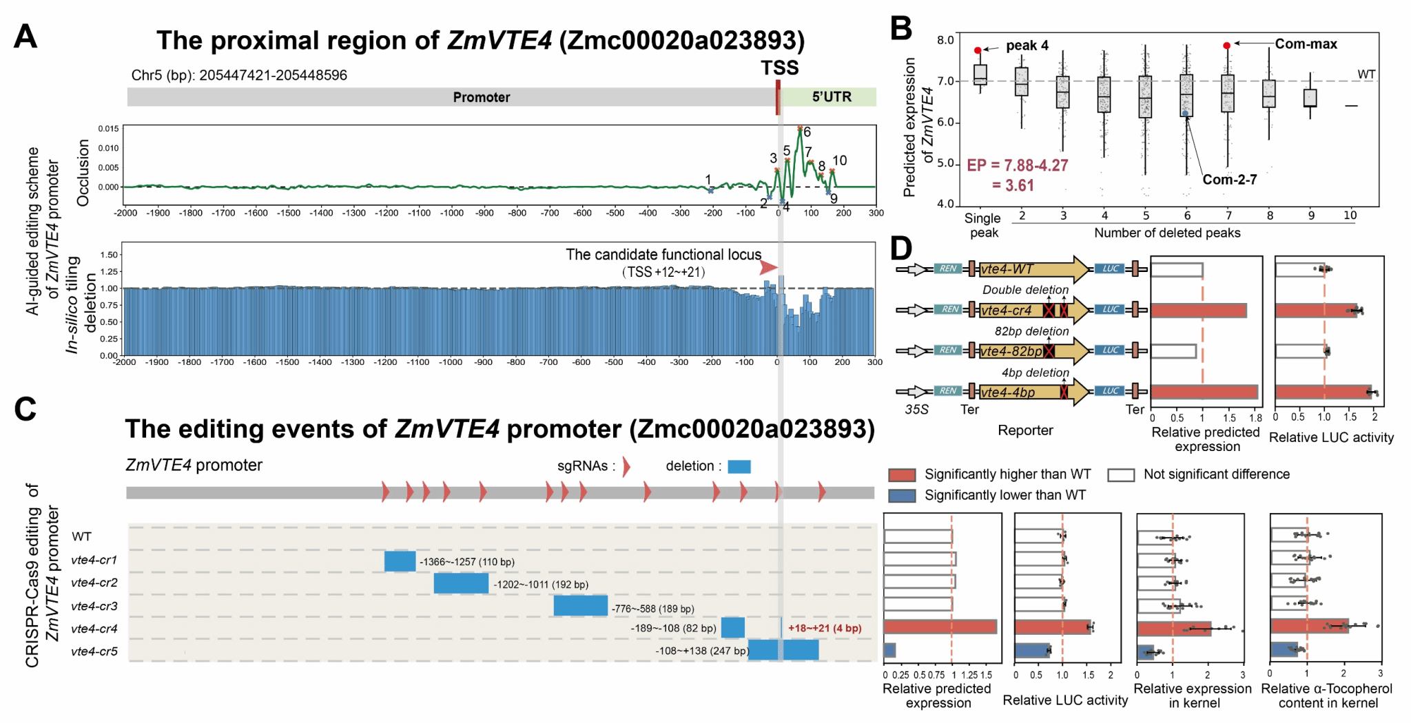 最后,作为一个具体实践的案例,该研究针对控制玉米籽粒VE含量的主效基因ZmVTE4,在编辑可塑性分析的引导下,锁定了其5’UTR中的一个小区域(图3A中的peak 4)。通过设计靶向该区域的sgRNA(同时设计靶向无显著效应区域作为负对照)的基因编辑实验,在AI的引导下成功创造了一个4-bp删除(peak 4内部)的变异材料(图3C,自然界中不存在的变异),能实现玉米籽粒VE含量显著提高的最优表型。