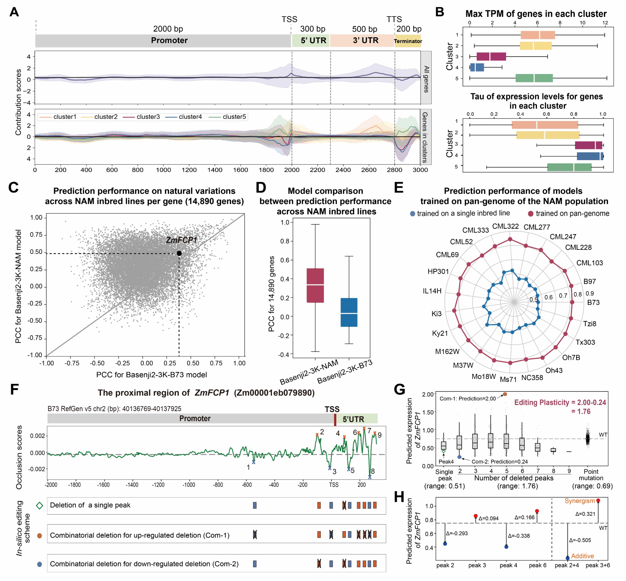 针对编辑结果盲目性较大问题,该研究聚焦基因近端3K的调控区,通过构建一个输入序列为3K的短序列—表达预测模型(Basenji2-3K-B73)来识别近端元件。而且,通过进一步整合泛基因组数据,增加包含更多遗传变异的样本,最终得到 Basenji2-3K-NAM 模型,实现了启动子CRE的精准识别(图2F,包含元件的基因组位置及其调控目标基因表达的具体效应,精度10bp),解决了定性的问题。更为重要的是,创新性地提出了一个“编辑可塑性”概念,通过计算的方式模拟各类组合编辑事件对基因表达的影响效应(图2G-H),最终用于量化基因启动子区域的编辑对基因表达的调控潜力,给出了定量的方案。