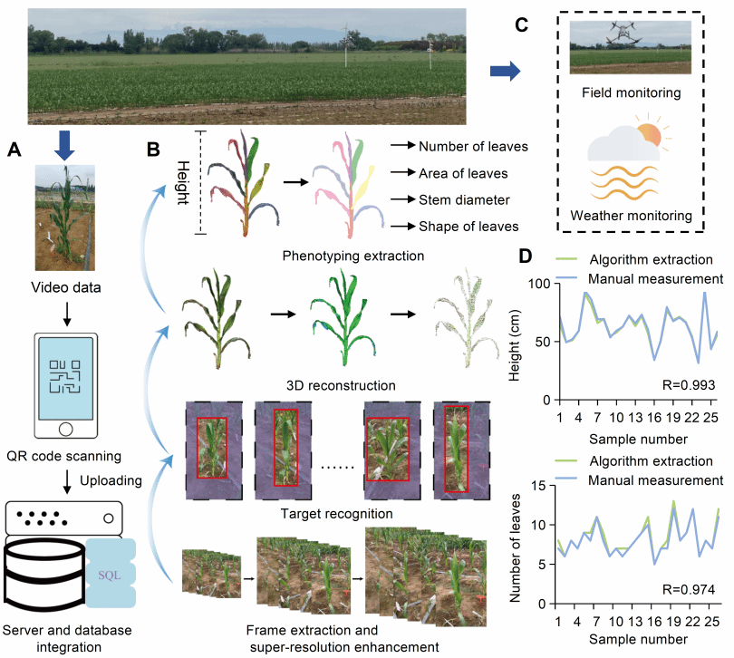 传统的手动表型分析不仅耗时长、重复性差,还需高强度劳动且容易出错。为提高效率,本研究开发了一套完整的田间表型提取流程,包括通过微信小程序进行数据采集,3D高斯泼渐算法重建玉米植株,点云分割算法或交互式分割方法提取表型。借助AutoGP平台,用户只需一部智能手机,即可快速获取详细的玉米植株点云模型及表型信息,如玉米高度、叶片数量和叶夹角。这一流程显著提升了田间表型数据获取的效率与准确性。育种家只需要一部手机即可实现田间表型采集与数据保存、管理、检索、以及后续的设计育种。
