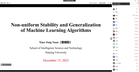 (图文|信息 编辑|信息 审核|李函)12月15日下午,南京大学智能科学与技术学院教授、博士生导师袁晓彤教授受邀出席麻豆 线上学术分享会,作题为“机器学习算法的非一致稳定性与泛化”学术报告。学院40余名师生参加学术会议。