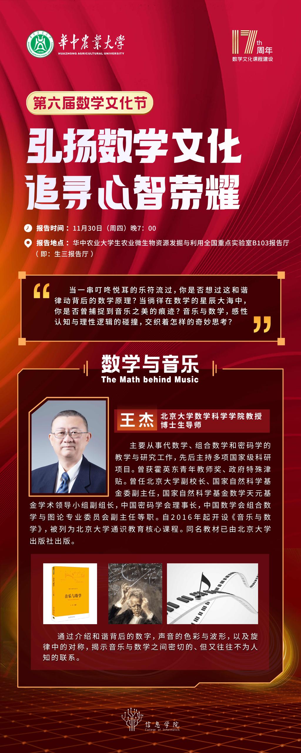 本场专家报告,试图通过介绍和谐背后的数字,声音的色彩与波形,以及旋律中的对称,揭示音乐与数学之间密切的、但又往往不为人知的联系。