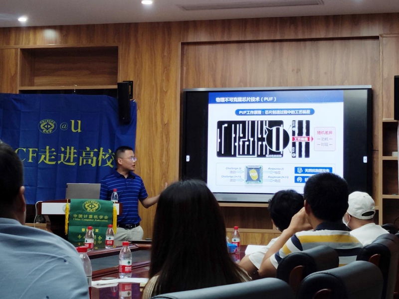武玲娟代表学院对CCF容错专委3位学者及师生的到来表示热烈欢迎,并对3位学者作了简要介绍。张吉良教授介绍了专委的历史、近期专委承办的学术活动和年会等,然后他以“集成电路硬件安全”为题,从中国对集成电路的需求、芯片自给率不足以及中兴华为事件出发,介绍了当前集成电路面临的硬件木马、侧信道、逆向工程等严重安全威胁。接着介绍了新型集成电路硬件安全关键技术,物理不可克隆芯片(PUF)设计及应用、集成电路芯核(IP)保护技术以及硬件辅助安全等前沿研究方向,并介绍了课题组在物理不可克隆安全芯片研究、IP核保护等领域取得的系列研究成果。