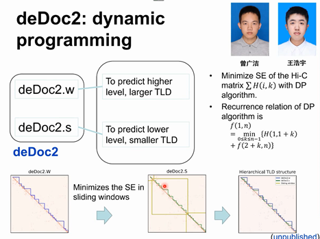 张治华就之前和现有工作进行了详细介绍:首先是DeDoc,一种基于信息熵理论和贪婪算法来寻找局部最优的TAD结构,但这个算法在单细胞数据中效果并不理想;其次是deTOKI,一种基于滑动窗口和非负矩阵分解的优化算法,从Hi-C矩阵中预测TAD边界,并在抽样、仿真和单细胞Hi-C数据中都达到较好效果,使用deTOKI能鉴定到TAD边界在单细胞中的变异,并且揭示了TAD在不同细胞之间存在一定异质特征;最后是deDoc2,在deDoc基础上进行了优化,使用动态规划算法寻找全局最优解,并且在大窗口和小窗口等多层次上进行TAD边界分析,结果显示deDoc2在各种不同数据中均表现良好,且对数据填充不敏感,因该算法利用了数据的全局特征,且有较强鲁棒性。