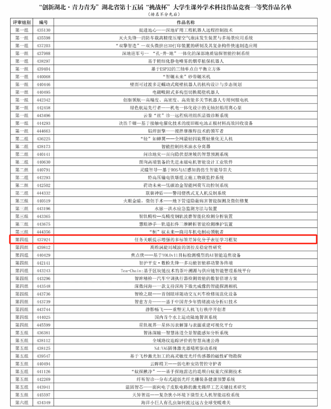 (通讯员 | 朱迅 编辑|朱迅 初审 | 李昱含 高睿琦 终审 | 袁嘉晨)5 月 29 日,“创新湖北・青力青为” 湖北省第十五届 “挑战杯” 大学生课外学术科技作品竞赛奖项公布,我院康林佳(2021级)、石梦瑶(2021级)、周松华(2021级)、覃粤(2022级)组成的团队,凭借作品《任务关联提示增强的多标签差异化分子表征学习框架》,在自然科学类学术论文赛道荣获省赛一等奖。该作品由章文教授、刘世超副教授、柯文涌老师共同指导。