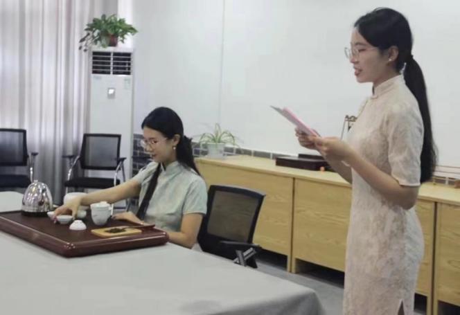 企业想加入乡村振兴的道路,实现更好的发展,首先就要找到自身的特色。实践团成员们结合房县的茶文化,借助茶学专业的学科优势,开展了茶艺表演和茶艺教学等系列活动。茶艺包括选茗、择水、烹茶技术、茶具艺术、环境的选择创造等一系列内容,是具有民族特色的优秀传统文化。茶学专业的曹雅婷、高天乐两位同学为大家演示了煮茶的过程,并进行了茶艺表演,在与诗源茶旅公司的茶艺师们的交流和互动中互相学习、共同进步,探索茶艺表演变成当地文旅特色的方式和可能性,让茶艺带动当地茶产业发展的同时也能够弘扬我国的优秀传统文化。