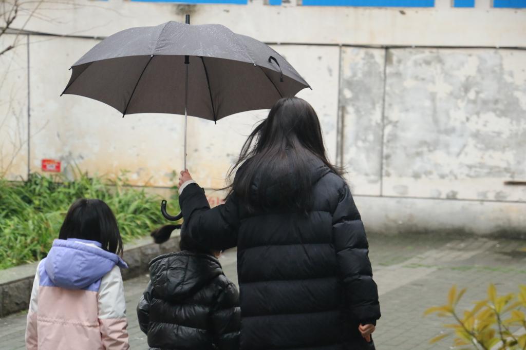 志愿者雨中为小朋友撑伞