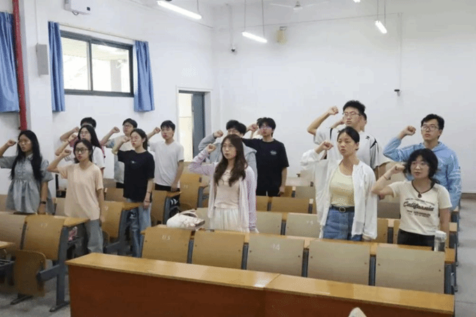 在宿紫涵的带领下,全体新团员面向团旗,举起右拳,庄严宣誓。铿锵有力的誓言,展现出他们对共青团的忠诚和为崇高理想不懈奋斗的决心。