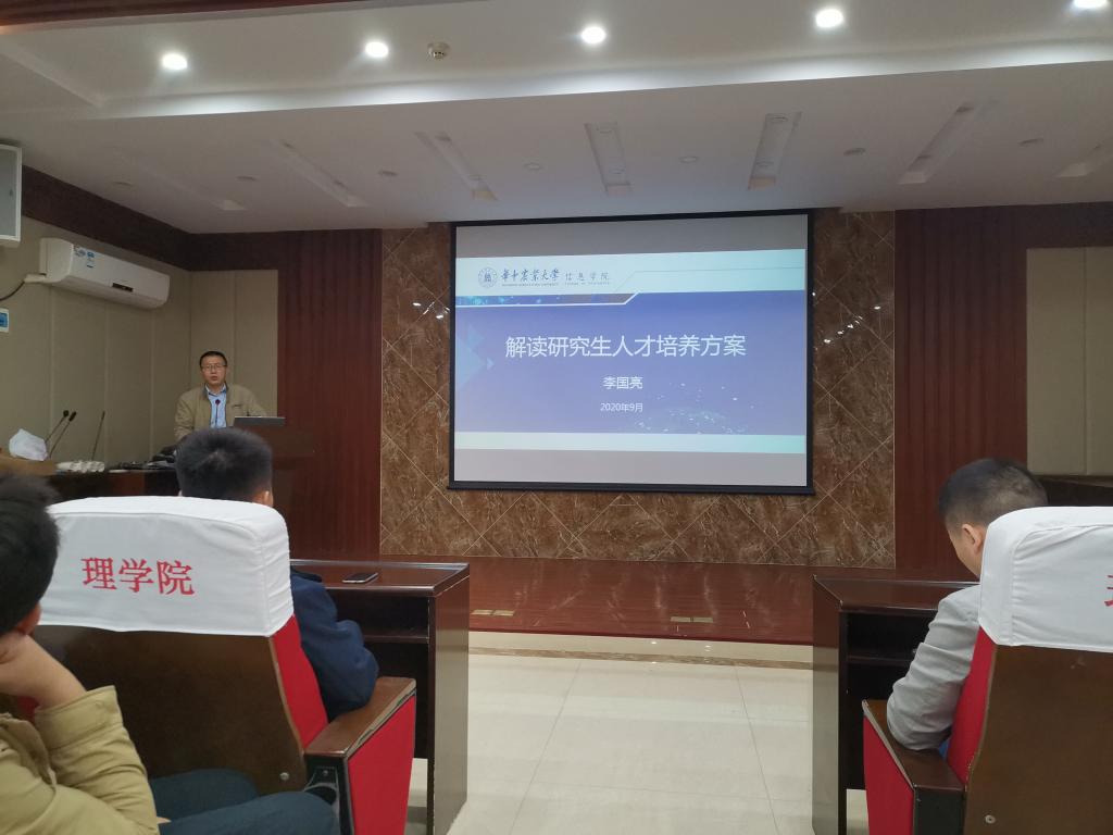 随后,副院长李国亮对2020级的研究生人才培养方案进行了解读,解释了一级二级核心课程和选修课程的设置,以及不同研究方向的学生该如何选课的问题。李国亮强调,选修课不仅仅局限于人才培养方案上罗列的课程,还可以选修其他学院的专业基础和前沿课程,成为交叉型人才。接着,他讲解了研究生的毕业基础条件,应当有文章的发表,在这个过程中得到文章撰写水平和科研能力的锻炼和提升。同时,作为华农麻豆 的学生,每一位同学还应该以“为了人类心智的荣耀”作为更高的要求而不断努力,奋斗。