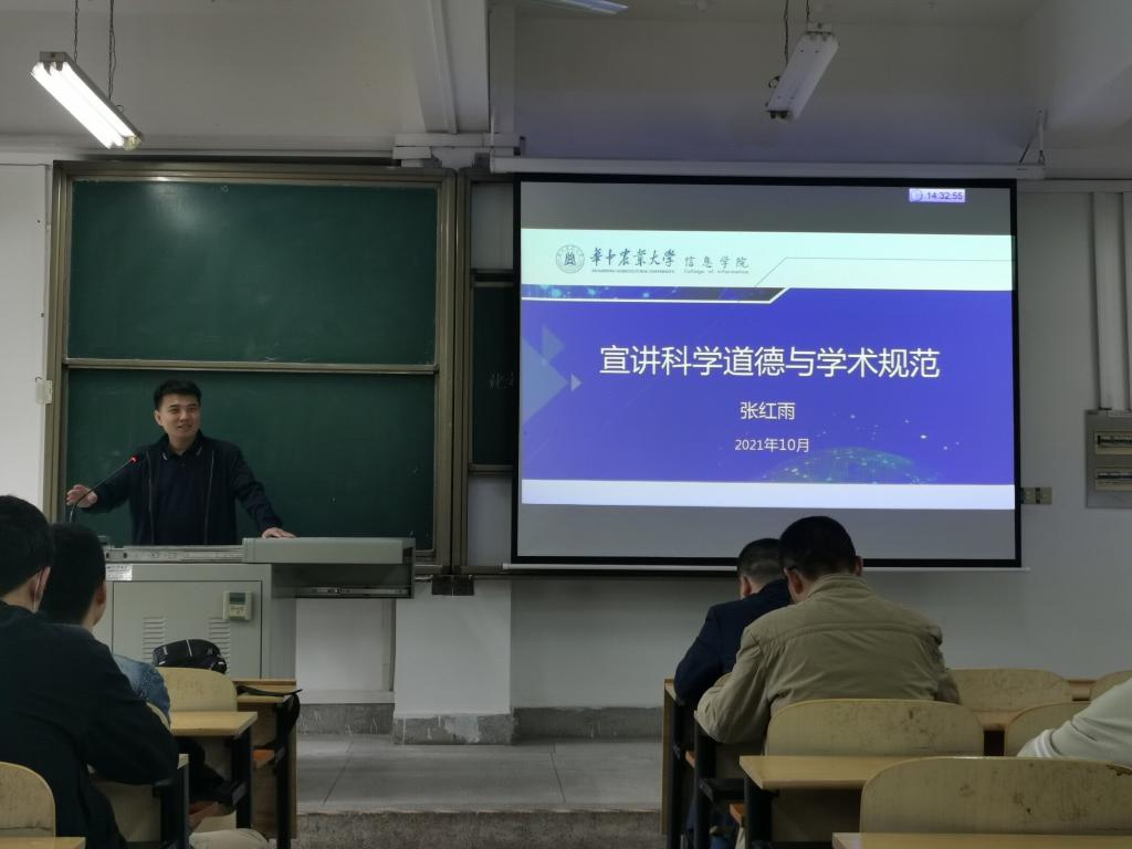 张红雨教授结合自身求学经历同新生们强调了树立正确的学习、生活价值观的重要性。他表示:研究生阶段是收获知识、增长能力为人生发展打下坚实基础的重要阶段,要做好吃苦的准备,珍惜时间提升自身文化底蕴和综合素质。张红雨教授着重强调了学术道德和科学规范,他认为要把“为了人类心智的荣耀”作为价值追求来做学术研究,研究生要遵守学术道德规范,防范学术失范行为,他还勉励新生“忍住科研的寂寞,将课题做到极致,什么领域都能做出大成就”。