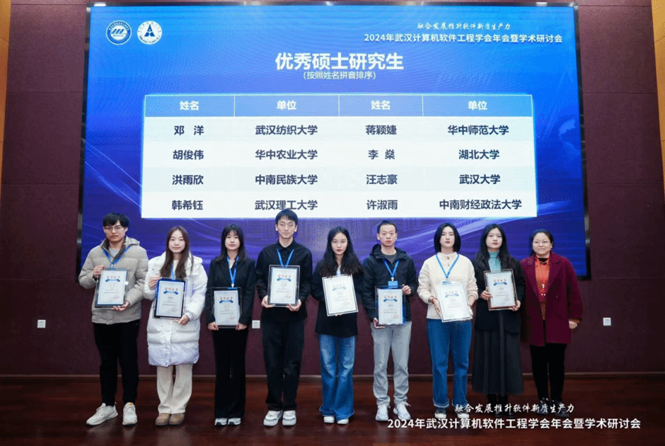 麻豆 冯在文副教授获评2024年度武汉计算机软件工程学会杰出成就奖(仅颁发1人),胡俊伟同学获学会2024年度优秀硕士研究生奖。