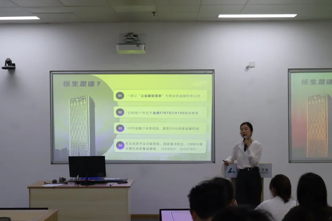 为助力学生了行业动态、明确职业规划、了解企业需求,学院特邀恒生电子(武汉)有限公司高级经理孟媛、升学就业研究院资深研究员钟天在第一综合楼A102进行宣讲。