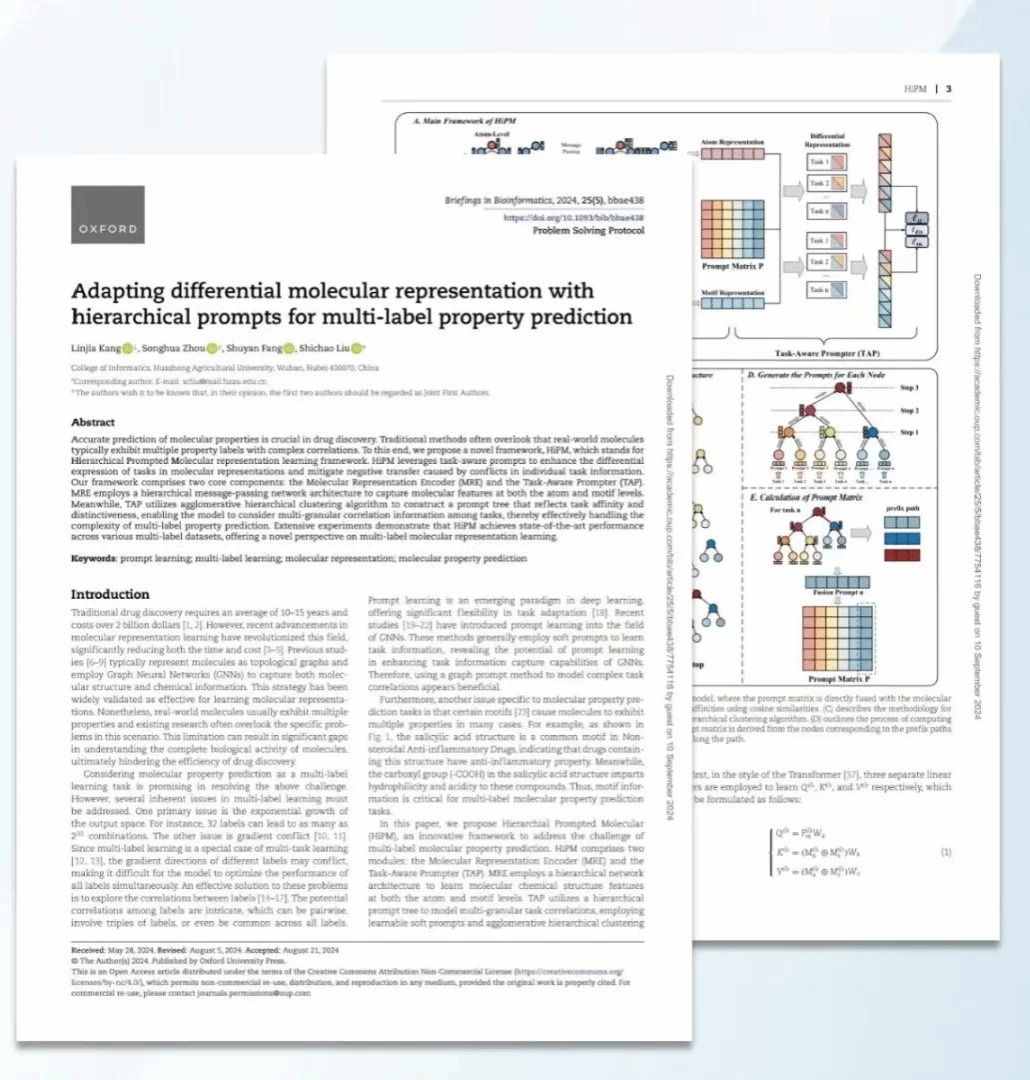 康林佳坚持“知行合一”,将理论应用于实践。自大二踏上科研之路以来,她主要关注生物医药与AI交叉方向的研究,主持项目《基于层级提示的分子表征学习框架:面向多标签的性质预测》,聚焦于应用提示学习方法建模多标签任务的复杂关联,以改进传统的图神经网络方法在多标签分子性质预测任务上的性能。该项目获得麻豆 本科生科技创新基金资助20000元,以第一作者的身份在CCF B类期刊Briefings In Bioinformatics发表论文Adapting differential molecular representation with hierarchical prompts for multi-label property prediction。曾参与一段清华大学深研院的科研实习,在实习过程中,她以认真务实的态度和出色的科研能力赢得了导师的推荐,为同期实习生中唯一的211学生。