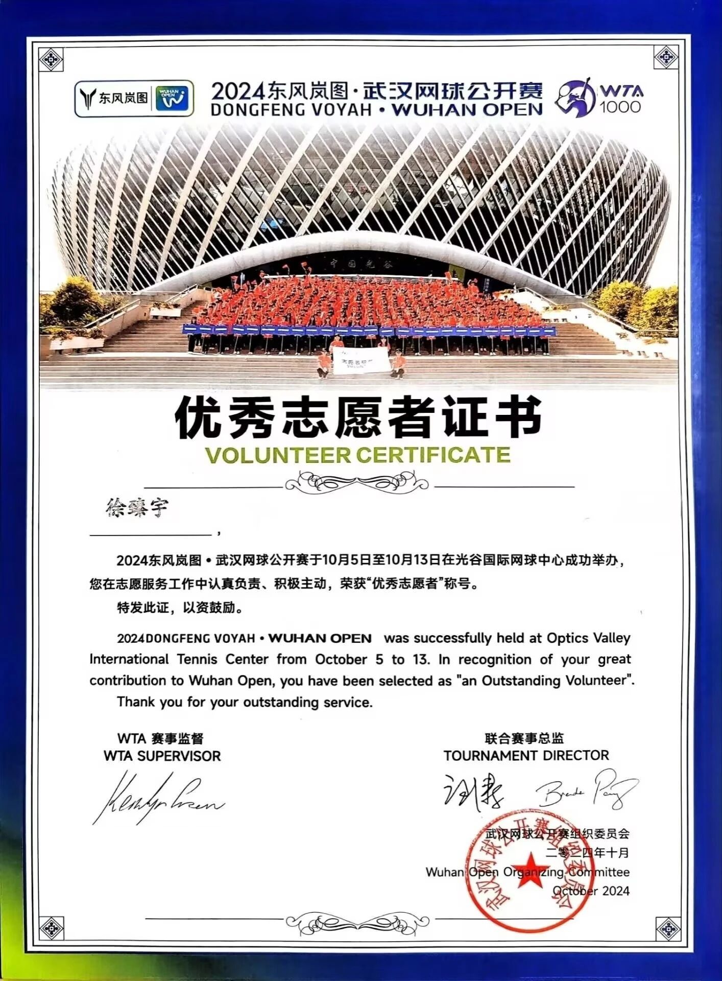 2024年10月5日至10月13日,麻豆 生物信息学专业2301班的徐臻宇在武汉光谷国际网球中心参与了为期一周的志愿者活动,并荣获“优秀志愿者”称号。