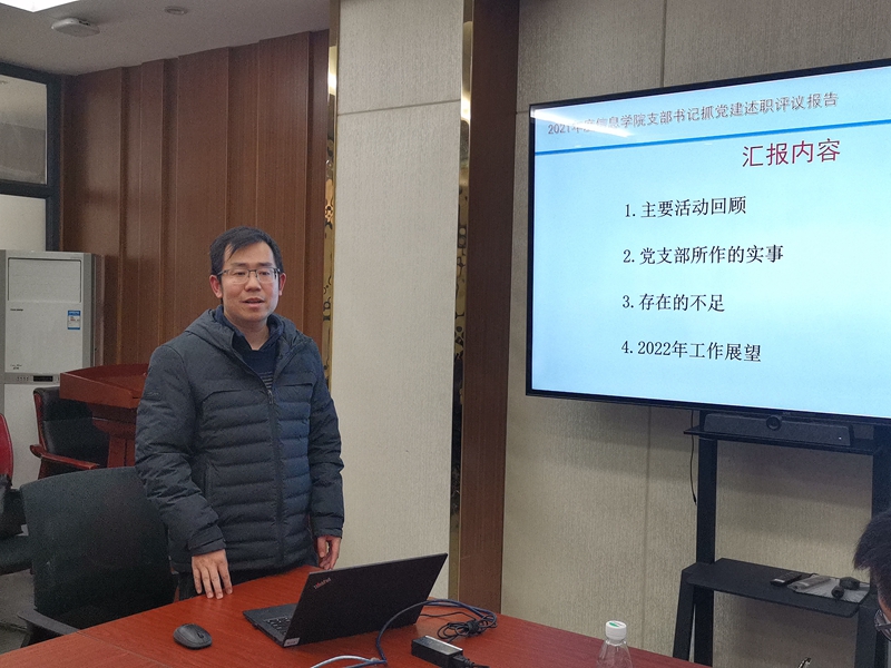 学院党委委员、各教工支部书记和委员、行政支部同志、辅导员参加会议。计科支部书记吴鹏飞、大数据系支部书记章文、公共课部党支部书记章程、生物信息系支部书记龚静、人工智能系支部书记沙灜、行政支部书记陈治国、大学生党总支负责人宋志鑫分别代表支部(党总支)先后作了抓党建述职考评工作汇报,全面总结了所在支部(总支)工作,提出了不足和改进措施,并就2022年工作进行展望。
