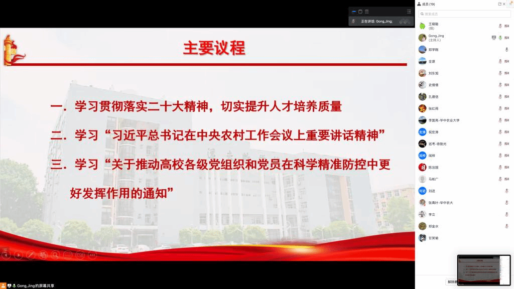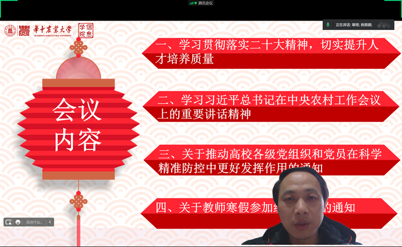 (图文|辛西 编辑|信息 审核|刘进)1月5-6日,各教工党支部纷纷开展元月份主题党日活动,进行专题研学。在支部书记或支委的带领下,支部(系部)成员专题研学了“学习贯彻落实二十大精神,切实提升人才培养质量”、习近平总书记在中央农村工作会议上重要讲话精神以及教育部思政司文件《关于推动高校各级党组织和党员在科学精准防控中更好发挥作用的通知》。学院领导班子成员全员参加了生物信息支部(系部)的主题党日活动。学校派驻广州影子公司专家团临时支部也开展了主题党日活动。