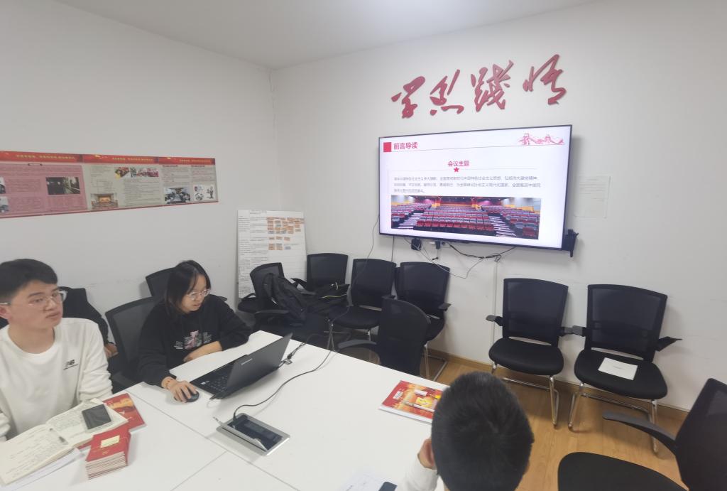 会议开始,成盛以播放视频的形式向参会成员开展了习近平总书记在中共中央政治局第一次集体学习时的重要讲话精神的领学分享。“党的二十大在政治上、理论上、实践上取得了一系列重大成果,就新时代新征程党和国家事业发展制定了大政方针和战略部署,是我们党团结带领人民全面建设社会主义现代化国家、全面推进中华民族伟大复兴的政治宣言和行动纲领。”成盛根据习近平总书记的讲话精神再次强调。“习近平总书记的讲话,为今后对党的二十大精神的学习提供了思想上的指南,我们要把学习宣传贯彻党的二十大精神作为支部的首要政治任务!”随后,成盛通过PPT形式,带领同学们系统学习了二十大报告相关内容。