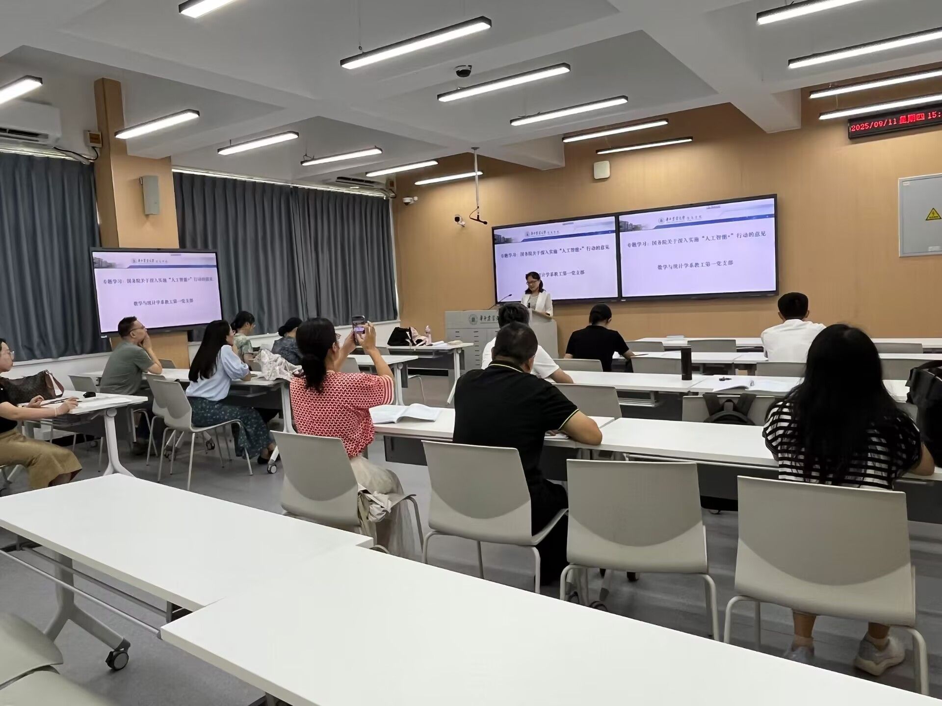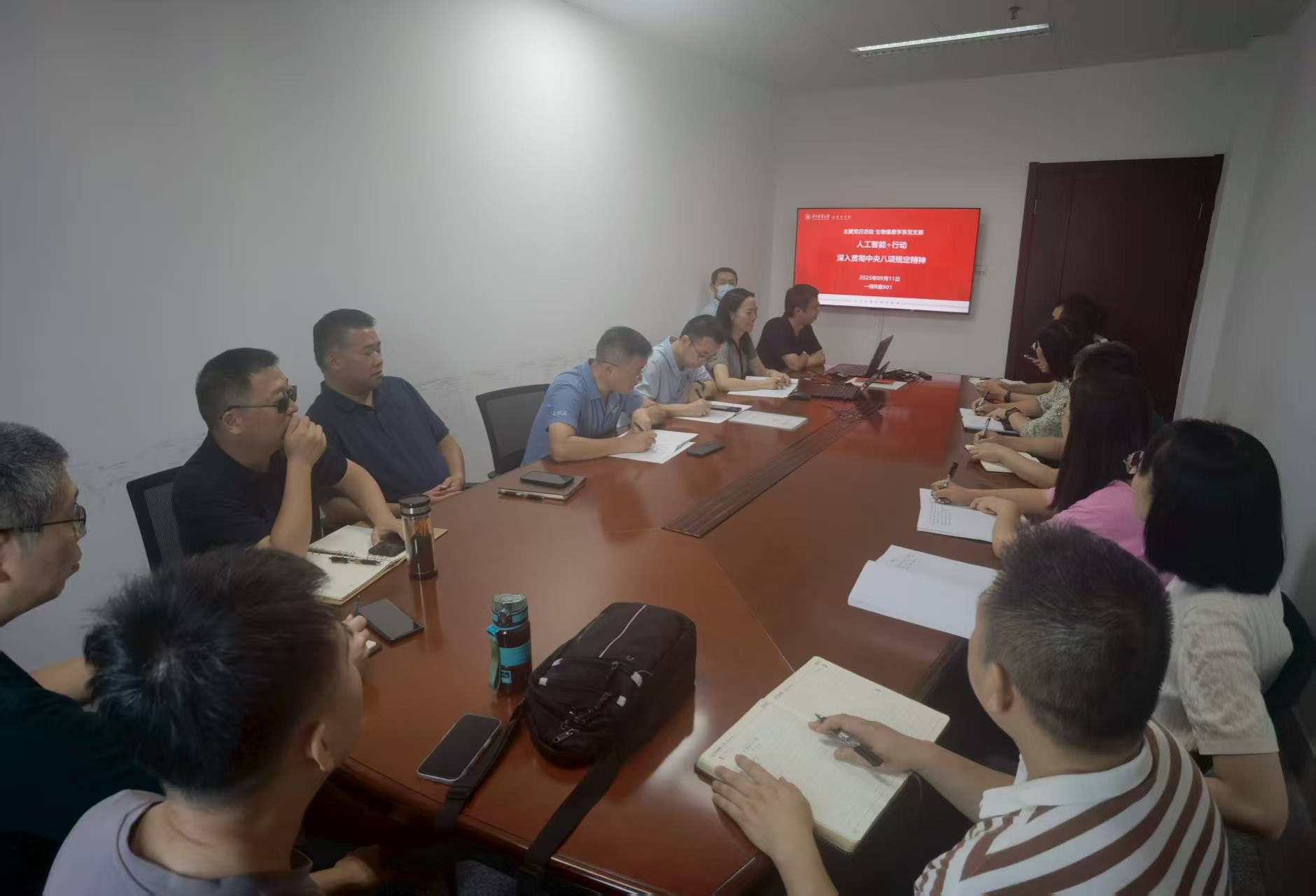 视频学习环节,各党支部、系部教师集中收看了主题视频《习近平作出重要指示强调 锲而不舍落实中央八项规定精神 推进作风建设常态化长效化》以及教师节展播视频学习:陈华癸院士事迹、张献龙院士事迹等内容。在专题研学环节,各党支部在党支部书记(委员)的带领下,结合学院、学科、专业建设实际,深入学习了《国务院关于深入实施“人工智能+”行动的意见》(国发〔2025〕11号),并围绕专题深入交流了学习体会。结合实际,部分党支部就“习近平总书记回信勉励全国特岗教师代表”“习近平总书记在纪念中国人民抗日战争暨世界反法西斯战争胜利80周年招待会上的讲话”等内容开展了集中学习研讨。部分党支部书记面向与会教师讲授了专题党课。