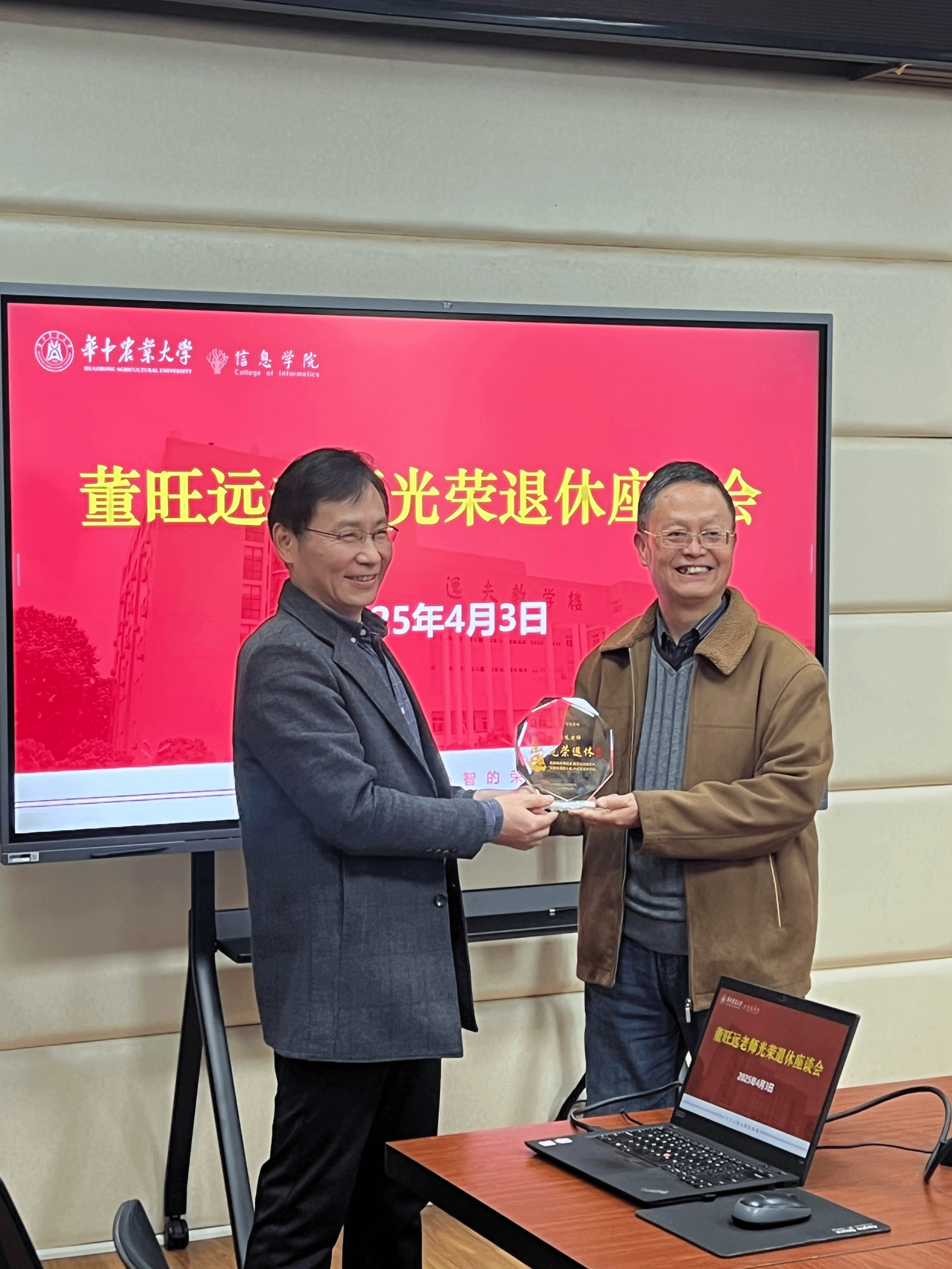 最后,董老师发表退休感言。他感慨四十年岁月如歌,感恩遇上了国家蓬勃发展大好年代,一直身处国泰民安中。仿佛就在昨天,17岁上大学。1986年入职甘肃农业大学时,因面貌青涩,还被误认为是学生,不让进教工食堂就餐。2002年调到华农后,悉数得到了学校各级领导关心与支持,在科研启动金上,在主持学校的重点课程评选时,在出国访学中,感觉都很幸运,同时总结只要卖力、认真地去工作,组织、学校会看到,会支持。接着,董老师说,他见证了理学院的“开枝散叶”,也见证了麻豆 的诞生与成长。记得在一次教代会提案中,他就提出过成立以数学和计算机专业为基础的信息类学院,在他退休前实现了。